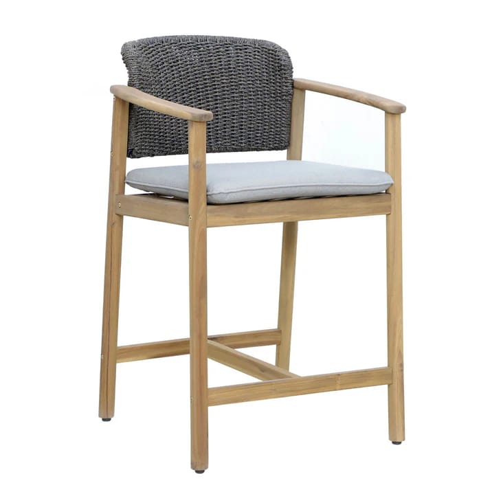 Alexis Barstool, Informed by midcentury modern design yet of the moment, our sculptural collection. Mixing materials to elegant effect, an open and architectural teak frame pairs with handwoven all-weather wicker . The seamless juxtaposition of textures and the graceful play of curves and angles is understated yet compelling and complex. Frame is guaranteed for life.